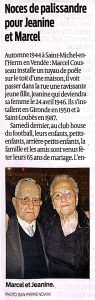 Sa rencontre avec son futur conjoint, Marcel, se scellera par leur mariage en 1946 à Saint-Michel-en-l’Herm. Elle a alors 20 ans. Les noces dureront huit jours ! Il y a cinq ans, le couple fêtait ses 75 ans de mariage. Son conjoint décédera peu de temps après.